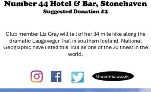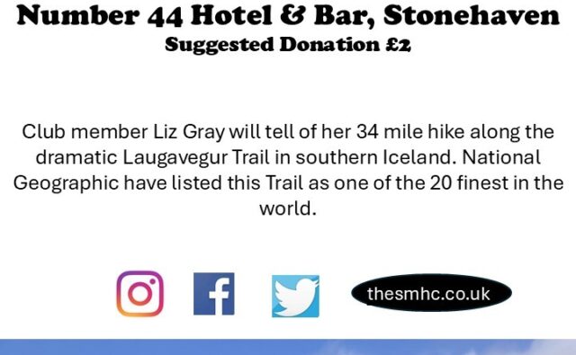 Club member Liz Gray will tell of her 34 mile hike along the dramatic Laugavegur Trail in southern Iceland. National Geographic have listed this Trail as one of the 20 finest in the world. The talk start time will be 7.30pm at No.44 Hotel & Bar Stonehaven. Non members welcome.