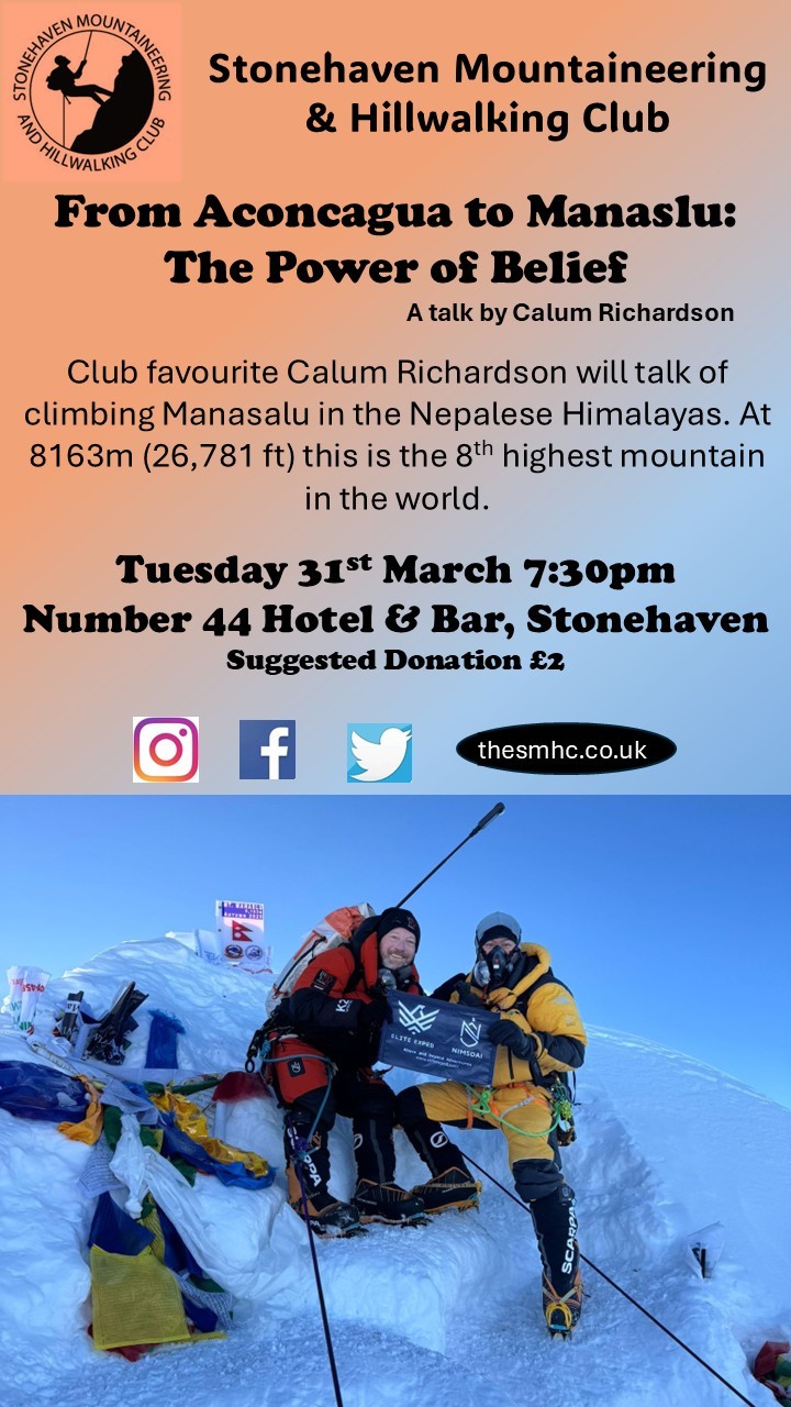 Club favourite Calum Richardson will talk of climbing Manaslu in the Nepalese Himalayas. At 8163m (26,781ft) this is the 8th highest mountain in the world. Talk will start at 7.30pm at No.44 Hotel & Bar Stonehaven. Non members welcome.