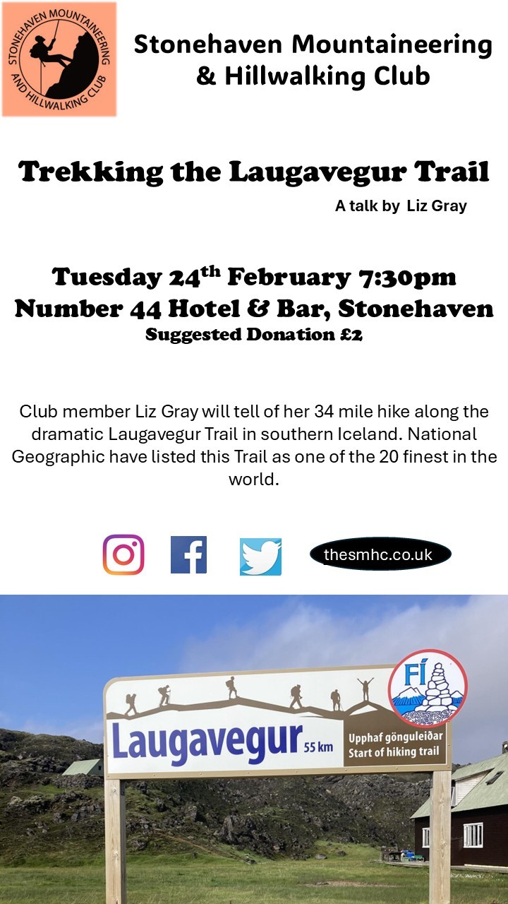 Club member Liz Gray will tell of her 34 mile hike along the dramatic Laugavegur Trail in southern Iceland. National Geographic have listed this Trail as one of the 20 finest in the world. The talk start time will be 7.30pm at No.44 Hotel & Bar Stonehaven. Non members welcome.
