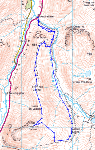 It is situated approximately 9km due south of Braemar. The walk will start just off the main A93 road at Auchallater, just south of the bridge over the Callater Burn where there is parking, however there is a charge, coins may be required. Our route will go south up Glen Callater for approximately 5km before heading west to the bealach and turning north to the summit of Creag nan Gabhar, continue north to Sròn nan Gabhar and take the path down the shoulder, south then east into Glen Callater and back to the car park.