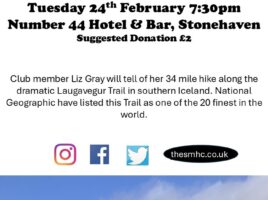 Trekking the Annapurna Circuit – A talk by Sandra Steel of our club starting 7:30pm at Number 44 Hotel & Bar, Stonehaven. Non members welcome. Sandra will give an insight into her 19 day trek on the classic, diverse Himalayan route in Nepal encircling the Annapurna Massif, famous for stunning …